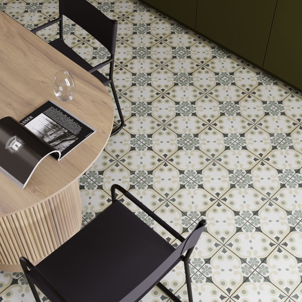 Praxisregel: Bei Musterfliesen und Vintage Optik lieber eine ruhige Fuge wählen. So wirkt das alte Musterdekor authentisch, die Fläche bleibt harmonisch und das Design bekommt genau die Wertigkeit, die Vintagefliesen ausmacht.